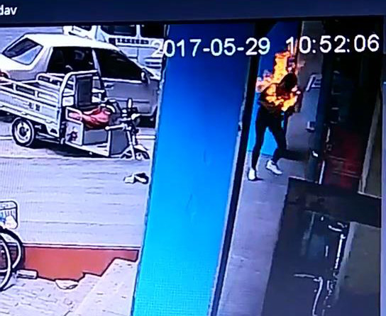 监控视频拍下了刘国艳被烧伤时的情景。图片来源/视频截图