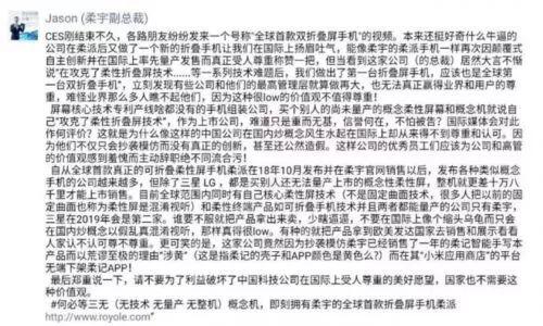 正所谓树大招黑,人红是非多,在林斌发布微博后不足24小时,疑似柔宇科技副总裁Jason的微信朋友圈截图引爆网络。该文指出,小米仅购买了LG的柔性屏概念机,并以此进行展示,并非真正的创新,甚至是公然造假;并称小米是核心技术专利产线啥都没有的手机组装公司。