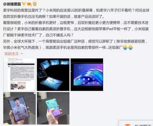 对此,有业内人士表示,小米确是使用LG的折叠屏幕,也确实应该算是“全球首款双折叠手机”(此前柔宇科技发布的柔派手机仅能进行一次折叠)。“小米的折叠手机更好,边框更窄,且双折叠后更小更方便携带,这不需要技术进行设计?柔宇自己看看自家的柔派折叠手机,这大边框都快跟苹果iPad平板一样了,小米组装厂都能干掉柔宇技术厂了,自己不嫌丢人吗?另外,全球大环境下,一个高管能说出组装厂这种话,感觉可以辞职了。”
