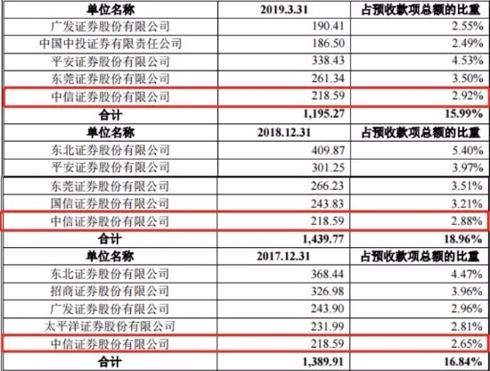 招股书显示,报告期内财富趋势曾用4800万元购买了中信证券的资产管理计划。此外,2017年末至2019年一季度末,在财富趋势的预收账款前五大客户中,中信证券的款项一直是218.59万元。