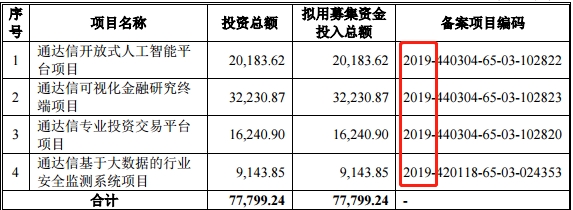 而这4个募投项目的备案项目编码,都是以“2019”开头。如,通达信开放式人工智能平台项目的备案项目编码为2019-440304-65-03-102822;通达信可视化金融研究终端项目的编码为2019-440304-65-03-102823。