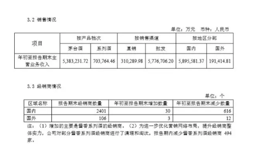 茅台三季报显示,截至9月底,包括茅台酒和系列酒,茅台共拥有2507家经销商,其中国内2401家。