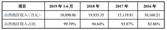 此外,位于太原市的精英数智还存在营业收入主要集中于山西市场的情况。2016年到2019年上半年,精英数智在山西市场的收入占总营收的比重分别为82.86%、93.87%、94.64%和99.39%。