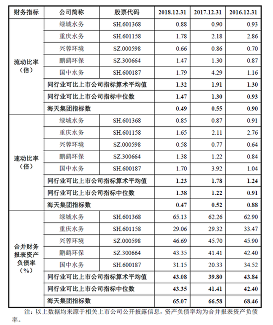 海天集团是以供水业务及污水处理业务为主要发展方向的综合环境服务运营商,在特许经营权范围内提供供水及污水处理设施的投资建设、运营管理及维护。供水业务及污水处理行业通常采用BOT、TOT等模式进行运作,投资回收期较长。在项目招标过程中,运营方需要支付大额投标保证金,同时,项目建设期运营方通常需要大量的资金投入,由此行业内企业资产负债率普遍较高。