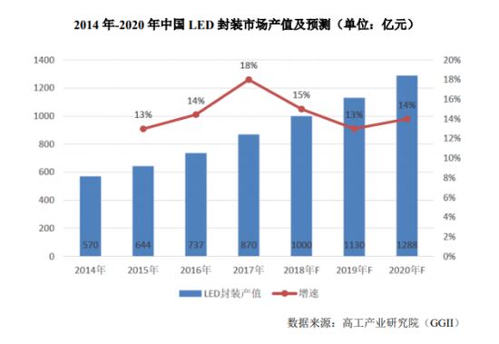 根据高工产研LED研究院(GGII)公布的数据,预计未来几年中国 LED 封装行业产值将维持 13%-15%的增速,低于2017年18%的增速,行业增速放缓。