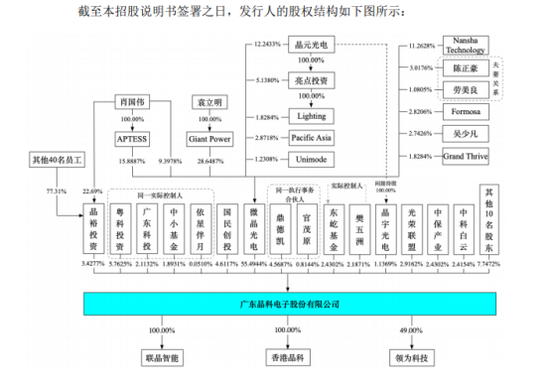 招股书显示,晶科电子控股股东为微晶光电,微晶光电的股权结构分散,持股比例超过10%的仅4位股东,分别是Giant Power(28.65%)、APTESS(15.89%)、晶元光电(12.24%)、Nansha Technology(11.26%)。