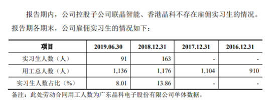 值得一提的是,晶科电子出现了其他受理企业罕见的问题。截至2018年末,公司实习生人数占比为 13.86%,超过了《职业学校学生实习管理规定》规定的实习学生的人数不超过实习单位在岗职工总数的 10% 的比例限制。