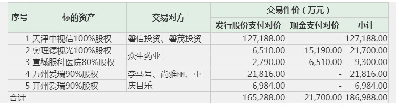 1月9日,爱尔眼科披露了《发行股份及支付现金购买资产并募集配套资金报告书(草案)》(下称“《报告书》”),拟以发行股份方式购买磐信投资、磐茂投资合计持有的天津中视信100%股权,拟以发行股份及支付现金方式购买广东众生药业持有的湛江奥理德视光100%股权与宣城市眼科医院80%股权,拟以发行股份方式购买李马号、尚雅丽、重庆目乐企业管理咨询合伙企业(有限合伙)合计持有的重庆万州爱瑞阳光眼科医院有限公司(下称“万州爱瑞”)90%股权与重庆开州爱瑞阳光眼科医院有限公司(下称“开州爱瑞”)90%股权。