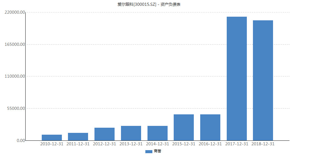 中新经纬记者梳理爱尔眼科自2009年上市以来商誉情况发现,2009年爱尔眼科商誉为459.55万元;2016年,爱尔眼科商誉账面原值4.61亿元;2017年,爱尔眼科商誉账面原值21.38亿元;截至2018年底,爱尔眼科商誉已达20.62亿元,较2009年增长超400倍,占总资产比例为22.5%,其中无形资产高达5.1亿元;截至2019年上半年末,爱尔眼科商誉余额已增至24.4亿元,占其总资产比例为21.53%,占净资产比例达38.74%。