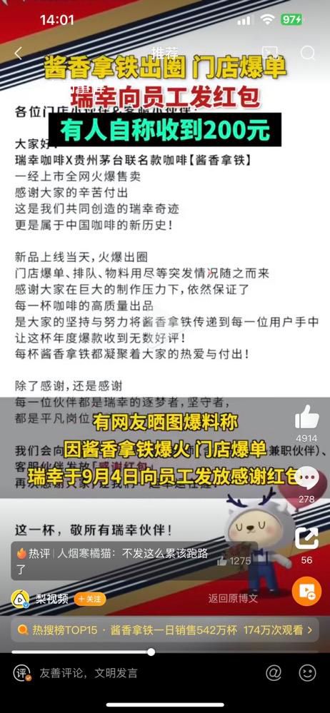 9月5日消息,今日,有网友爆料,瑞幸咖啡为感谢在岗工作人员在酱香拿铁爆单期间,能够在高强度的工作压力下保持门店正常运营,瑞幸于昨日向所有在岗咖啡师、全职及兼职、客户等工作人员发放感谢红包。有网友晒图红包最高200元,也有网友表示每个门店不一样。