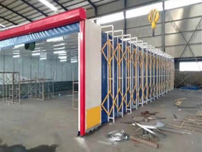 3、伸缩移动喷漆房整体为框架传动结构,每组框架间均有阻燃pvc布密封连接,安装快捷、外形美观,结构精巧,使用方便,制造成本低;